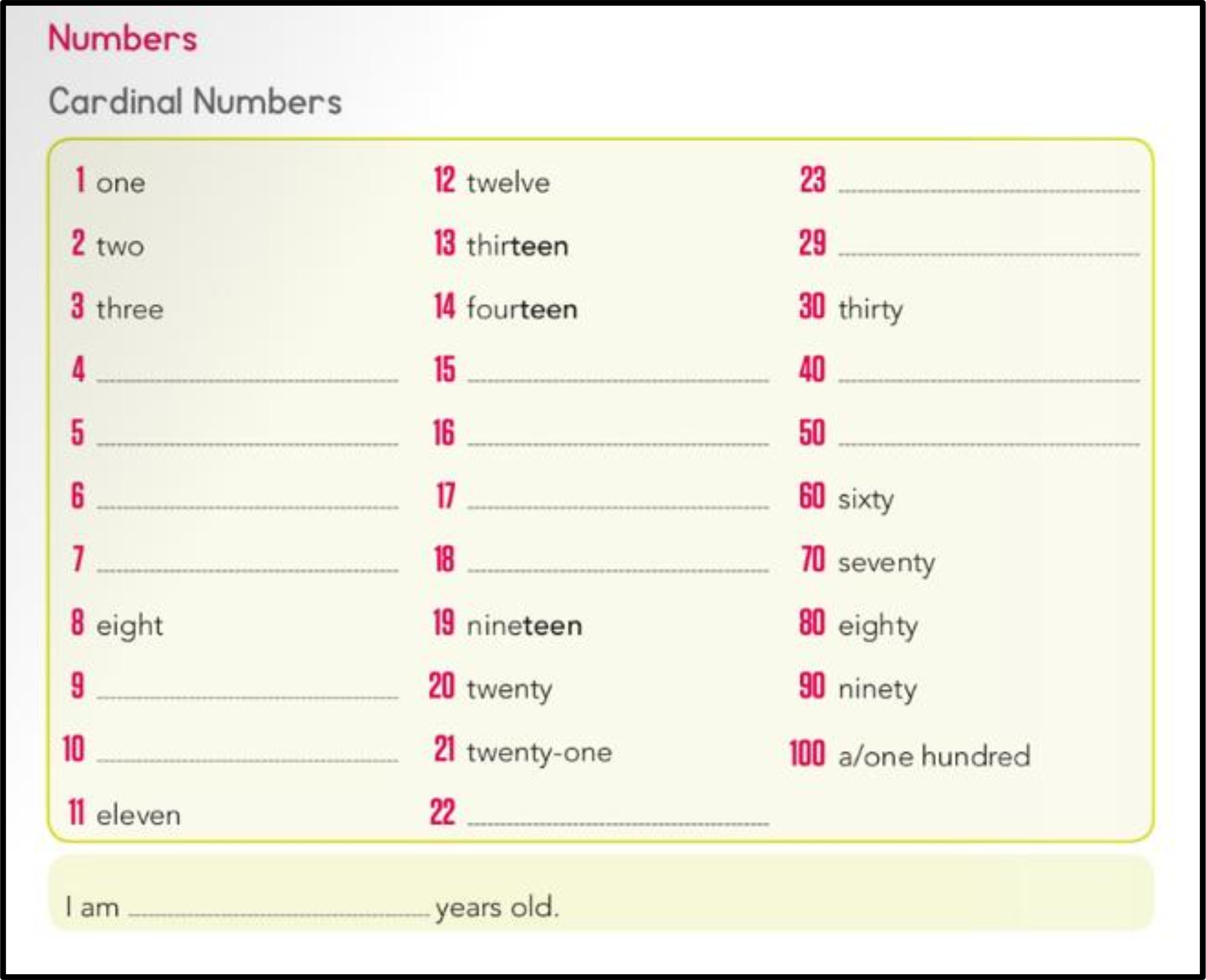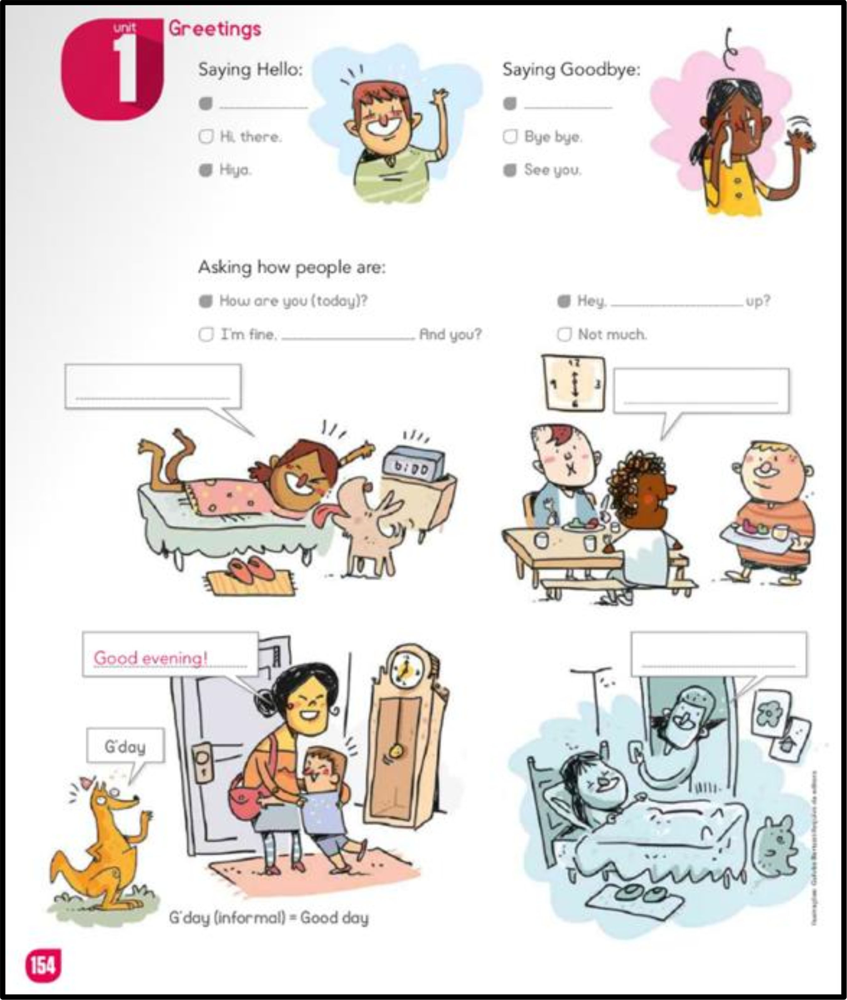 | 1 - Hello | Greetings - Subject pronouns, verb to be (affirmative form) | Comic strips, motivational posters |
