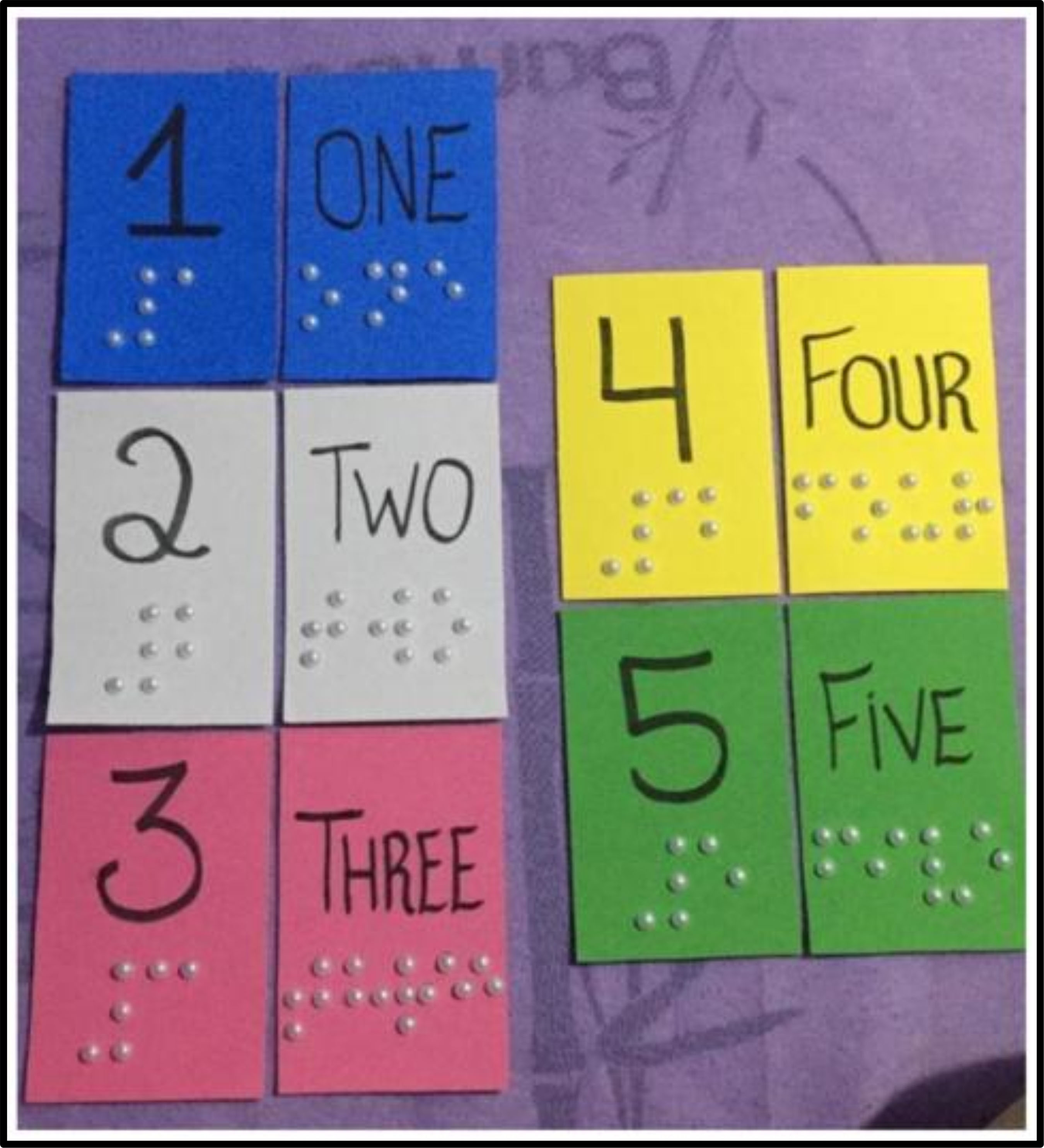 To cater to the needs of moderate visually impaired students and make the learning experience more accessible, the EAL teacher can create tactile cards with numbers in high relief. These cards can be made using various materials such as relief glue, popsicle sticks, or bead pieces, providing students with a tangible representation of each numeral. Moreover, for students familiar with Braille, the EAL teacher can also include Braille representations of the numbers on the cards, as shown in Image 7. The combination of both high relief and Braille ensures that visually impaired students can engage with the numerical concepts effectively.