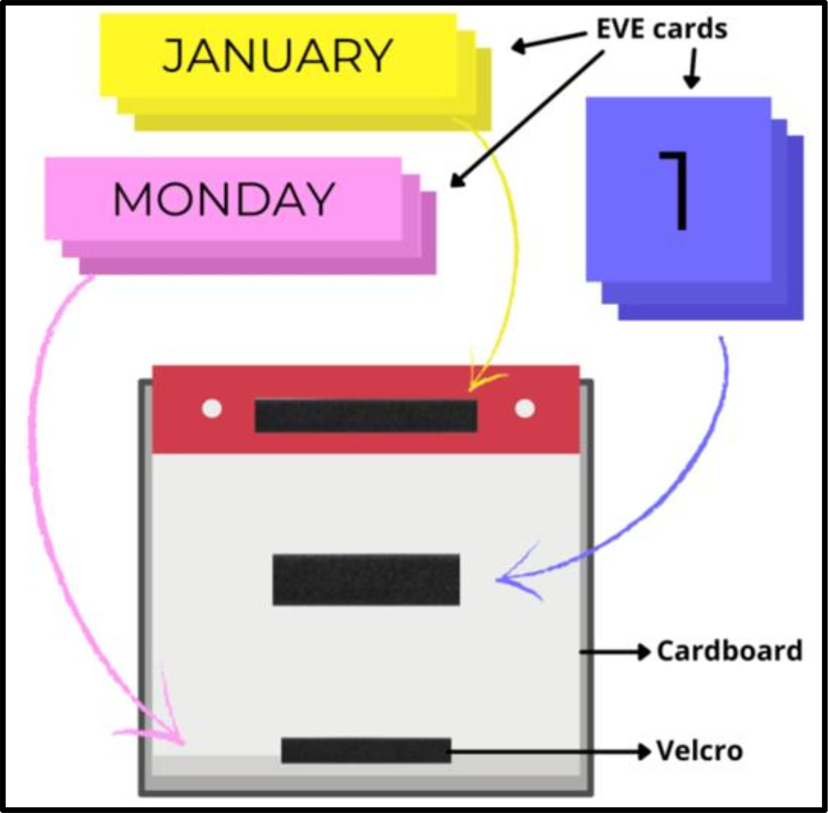 It is possible to create a high-relief calendar using Velcro, EVE, cardboard, and glue, which can be assembled and disassembled daily. Such activity can also be arranged together with activity C and/or activity B in order to design a more complete calendar. In this way, there would be three packs of EVE cards (one with seven cards for the days of the week, one with the 31 numbers constituting the months and another one with the 12 months), and also a piece of cardboard in which the day of the week, month and numeral would be glued with Velcro. As the former proposal, the words and numbers can be written in Braille or, like in the model below (created digitally), in the alphabetic/numeric system in high relief (Image 9). It is important to highlight that many students with visual impairments may not have had access to alphabetic writing and may not recognize Arabic numerals. Therefore, it becomes crucial for the teacher to have a deep understanding of their students' individual needs and abilities before creating an activity.
