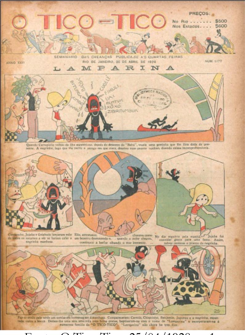 Fez-se então pela tarde um samba em homenagem á manhosa. Compareceram: Cartola, Chiquinho, Benjamin, Jagunço e a negrinha, espantada, calou a boca. Deram-lhe uma saia amarela com bolas pretas, baptisaram-na com o nome de “Lamparina” e incorporaram-na á numerosa família do “O TICO-TICO”. “Lamparina” não chora há tres dias (O Tico-Tico, 25/04/1928, p. 1).