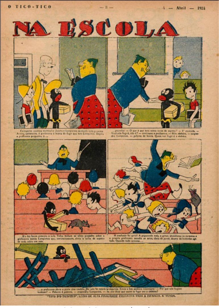 Na capa que traz a estreia da personagem, é destacado que ela teria uma linguagem incompreensível. Ao longo das histórias seguintes, é comum evidenciar que ela escreve e fala errado. No período investigado, aparecem poucas histórias que se ambientam em uma escola e apenas uma delas, que convém aqui mencionar, possui o título “Na escola”. Mas a narrativa não é necessariamente da personagem em um processo de aprendizagem, mas, sim, envolvida em uma das suas artimanhas. Na sala de aula em questão, a professora e as crianças retratadas são todas brancas. É contado que Carrapicho matriculou Jujuba e Lamparina na escola mais próxima de sua casa e, ao levá-los até lá, advertiu à professora que Lamparina tinha mania de fugir. Mas Lamparina prometeu para a professora que não fugiria e disse que quem iria fugir seria ela. Dito e feito: ela causou uma confusão soltando um rato na sala e todos saíram apavorados, menos Lamparina, que permaneceu e ainda reafirmou à professora que avisou sobre quem fugiria (O Tico-Tico, 04/04/1934, p. 8).