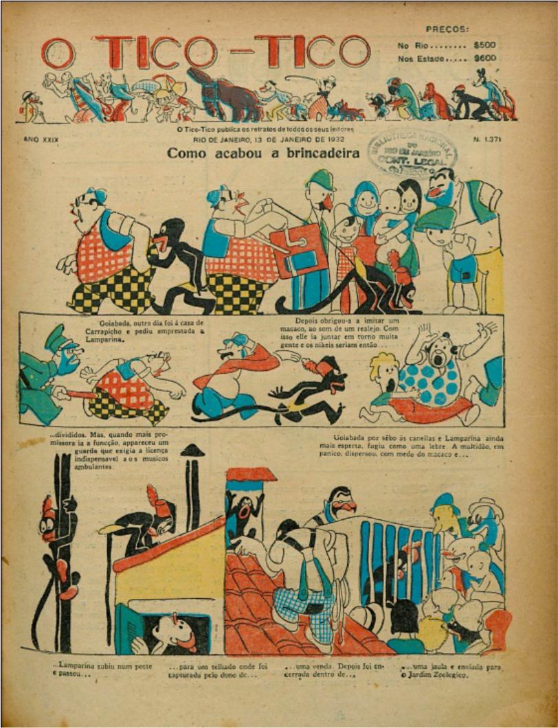 Assim, Lamparina está atrelada a uma perspectiva animalesca e de desajeitamento que conduz à sua desumanização. A visão da personagem como estando em par de igualdade com um animal podia ser notada nessas características físicas, mas também na forma como ela agia ou era tratada. Isso pode ser exemplificado se tomarmos duas histórias, uma continuidade da outra. Na primeira, é contado que Goiabada pediu Lamparina emprestada a Carrapicho, depois a colocou para realizar a imitação de um macaco, embalada pelo som de realejo, pois queria com isso receber dinheiro. Porém, durante essa ação, um guarda exigiu que Goiabada apresentasse a licença obrigatória dos músicos ambulantes; por não ter essa licença, ele e Lamparina fugiram. Lamparina subiu em um poste, depois passou para um telhado e o dono de uma venda a capturou. Então, ela foi enclausurada em uma jaula e levada para um Jardim Zoológico. As pessoas que haviam se juntado para ver a imitação correram com medo do macaco (O Tico-Tico, 13/01/1932, p. 1).
