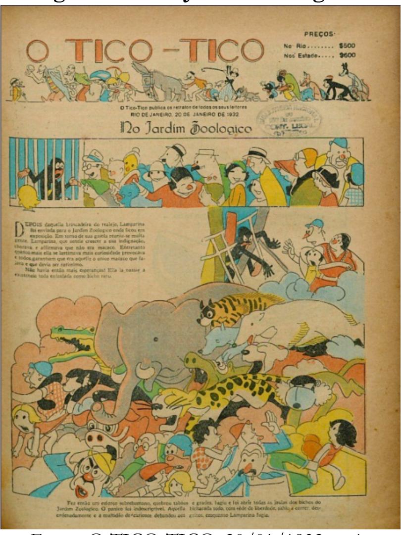 Na história seguinte, é narrado que Lamparina ficou em exposição no Jardim Zoológico, onde chorava e negava ser um macaco, mas isso só fazia com que os visitantes ficassem surpresos por acharem que ela era um macaco falante. Em um “esforço sobrehumano”, ela conseguiu sair da jaula e, de quebra, soltou os animais, fazendo a multidão correr (O Tico-Tico, 20/01/1932, p. 1).