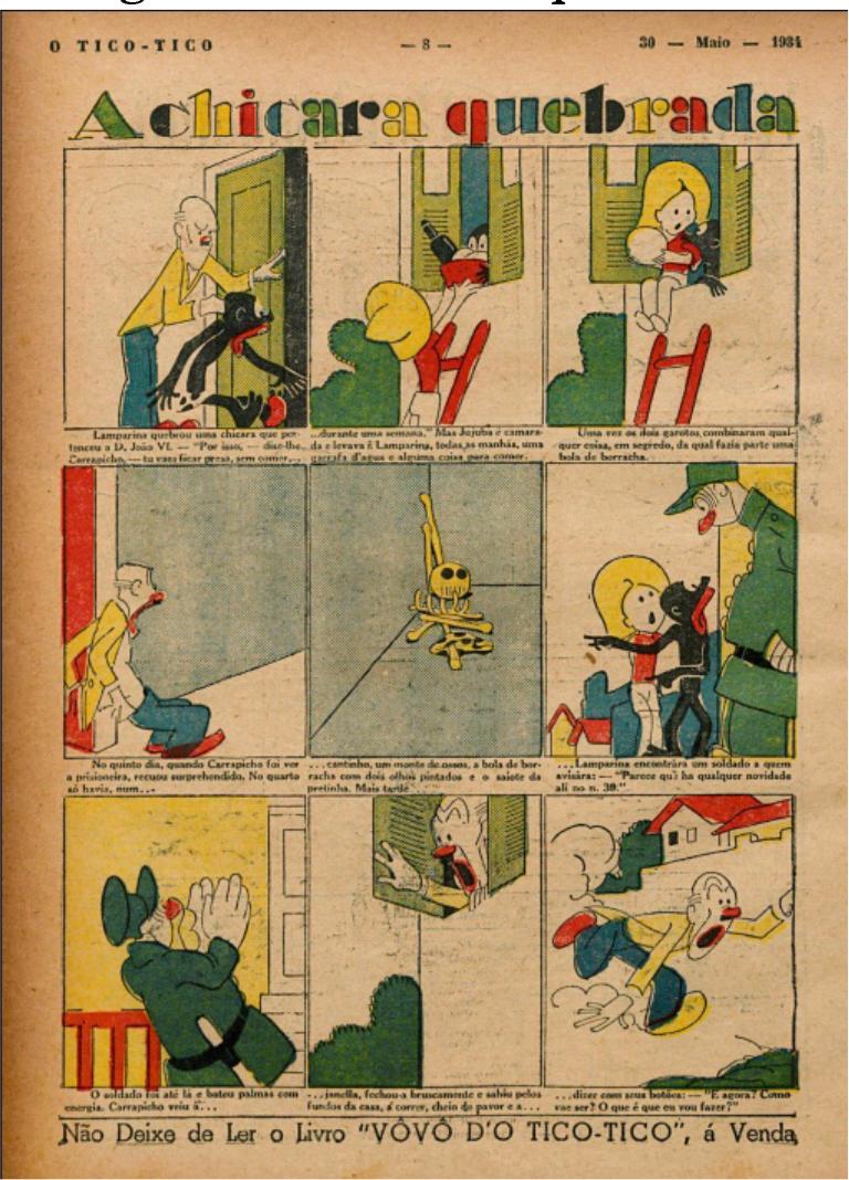 É importante delimitar que as histórias com a presença de Lamparina estiveram vinculadas à capa da revista até a edição 1382, do ano de 1932 (O Tico-Tico, 30/03/1932, p. 1); logo, tinham papel de destaque em O Tico-Tico. Mas é necessário pontuar que Lamparina não permanece na capa ao longo das futuras publicações, uma vez que, a partir da edição 1386 do ano de 1932, ela aparece na página 8 (O Tico-Tico, 27/04/1932, p. 8). Essa troca do local da publicação entre a capa para o meio da revista, por vezes para o final, indica que ela talvez tenha perdido sua força, cedendo espaço para outros personagens/atividades mais importantes aos olhos dos editores da revista