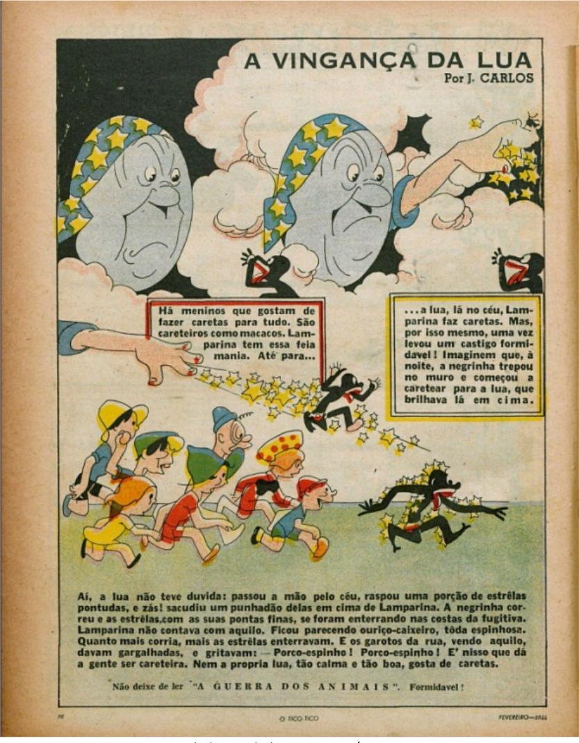 É expressivo verificar que nem mesmo um astro celeste escapou das travessuras de Lamparina e acabou por puni-la. E, diga-se de passagem, um castigo cruel, já que ao ser espetada pelas pontas das estrelas, a menina ficava incomodada, ao ponto de correr. Somado a isso, J. Carlos atribui fazer caretas a um comportamento de meninos e macacos, e coloca tal mania como sendo pertencente também a Lamparina, masculinizando-a e animalizando-a. As outras crianças na cena não se comoveram com o sofrimento da pequena; ao contrário, tiraram sarro. Afinal, Lamparina não seria digna de empatia e ajuda? A narrativa retrata a agonia da garota e o divertimento dos meninos. Essa história sintetiza pontos de sua animalização, suas atitudes seguidas de punições (para servir de exemplo) e a normalização de tudo isso.