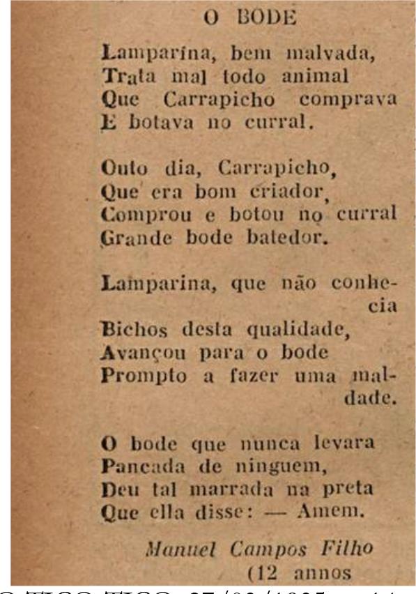 A revista contava com espaço dedicado para a publicação de histórias escritas pelos leitores. Na seção “Meu jornal”, aparece um texto que trazia como personagens Lamparina e Carrapicho, escrito por um leitor de 12 anos. A história, intitulada “O bode”, conta que Lamparina era malvada e destinava aos animais comprados por Carrapicho um mau tratamento. Um dia, Carrapicho teria colocado no curral um bode batedor, e Lamparina estava disposta a fazer alguma maldade com ele, mas o bode “[...] Deu tal marrada na preta Que ella disse: _ Amem” (O Tico-Tico, 27/03/1935, p. 14).