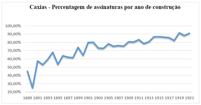 Se pensássemos ainda em uma análise sobre os registros por ano de construção, erroneamente poderíamos analisar o Gráfico 1, de Caxias, pensando que a taxa aumentou, apesar de haver quedas, de forma gradativa. Consoante esse viés, temos o trabalho de Magalhães (1994), que também organizou os dados por ano de nascimento, fato que reforçou a necessidade de se fazer um estudo que mostrasse a cronologia de vida dos sujeitos investigados. Expomos, no Gráfico 2, o resultado de Caxias por década de nascimentos para comparativo ao Gráfico 1 para, após, explicarmos metodologicamente o resultado.