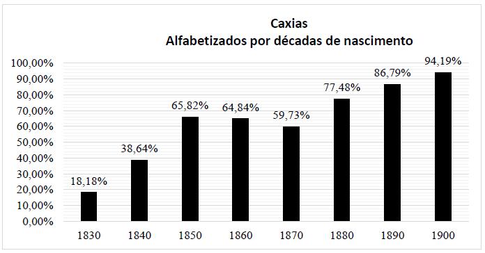 Com relação à produção da taxa por décadas de nascimentos, conforme Bernardi (2020) e Bernardi e Luchese (2020), percebemos que, se fizéssemos gráficos por ano de coleta das taxas, estes não refletiriam algumas informações e, com isso, precisaríamos produzir gráficos por décadas de nascidos. A título de exemplo, se existiam pessoas se casando em 1900 com 20 anos e, ao mesmo tempo, outras possuíam 40, 50 anos, um gráfico por ano de “construção de dados” não iria mostrar uma taxa de alfabetização em ordem cronológica dos sujeitos.