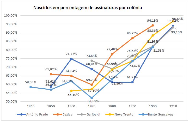 Este estudo apresentou o relato do percurso metodológico da produção de taxas de alfabetização com base em assinaturas obtidas dos registros civis das localidades de Antônio Prado, Caxias, Garibaldi, Nova Trento e Bento Gonçalves, pertencentes à Região Colonial Italiana do Rio Grande do Sul (RCI/RS), tendo como recorte temporal os anos de 1875 a 1920.
