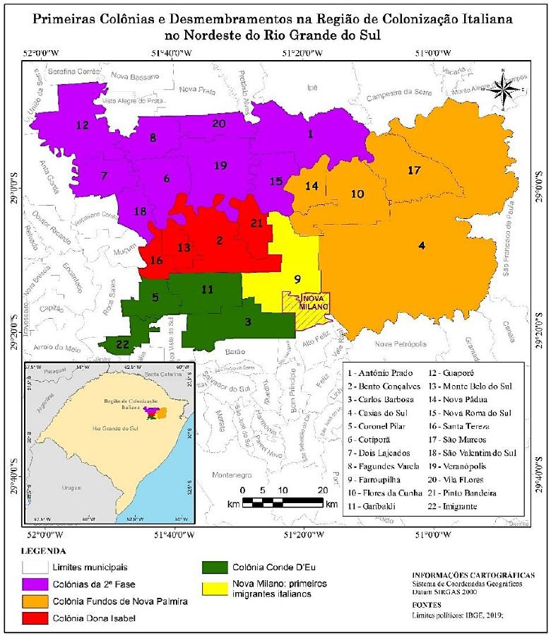 Optamos pela exclusão da cidade de Alfredo Chaves, por possuir características próprias e significativa presença de imigração polonesa; a inclusão de Caxias ocorreu por ser um “núcleo” da RCI/RS. Ademais, a se pensar nos registros civis, incluímos informações referentes a diversas localidades, hoje distritos e/ou municípios limítrofes, e foram adicionados os registros de Nova Trento por dois motivos: tanto por iniciarem ainda em 1896, quanto por uma perspectiva territorial, isto é, estendemos a discussão pensando em Caxias - Nova Trento - Antônio Prado em termos de territórios limites. No Mapa 1, apresentamos a delimitação da análise.