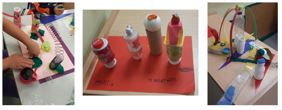 Finalmente, de forma individual, los niños/as hacen una escultura con los objetos reciclados que han traído de casa (las familias han sido avisadas desde comienzo de curso para que guarden todo tipo de envases, especialmente los más coloridos). Una vez terminada, les decimos que tienen que pensar un título para su obra y escribirlo. Las instrucciones son muy sencillas y abiertas, para dejar el máximo de libertad a los niños. Tienen muchos materiales a su alcance y las tres personas adultas les asistimos en aquello que puedan necesitar de nosotras. Un material que resulta realmente importante a la hora de pegar objetos con autonomía son las pegatinas de velcro de unos 2 cm de diámetro, que los niños pueden despegar y volver a pegar con facilidad en los dos elementos que quieren unir. Es inocuo, muy manejable y aguanta el peso de un envase de plástico.