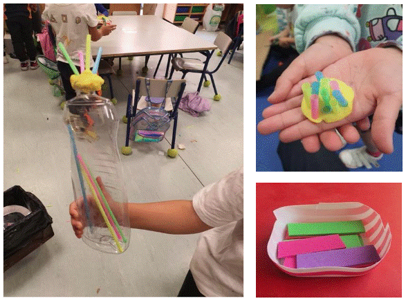 Igualmente, hemos podido observar cómo los niños y niñas construyen diferentes relaciones con los diversos materiales que les hemos proporcionado y cómo crean metáforas a partir de las formas. Su habilidad para generar ideas y metáforas ha sido notable, inclusive cuando la exploración de los propios materiales captó su atención durante bastante tiempo, fueron capaces de combinar estos materiales de forma enormemente creativa. Podemos considerar que, a través de la investigación y la exploración de los materiales y el uso de diferentes técnicas y procedimientos artísticos no solo han demostrado su gran capacidad creativa, también han explorado y reinterpretado su entorno mediante la experimentación multisensorial.