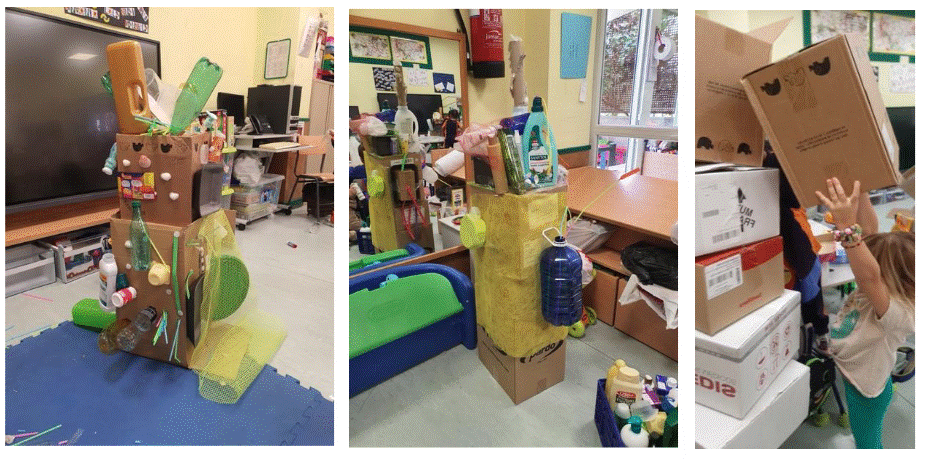 Después de todo este “calentamiento” pasamos, ahora sí, a construir una escultura grande en tres equipos, para que las tres personas adultas podamos supervisar a un grupo de niños (siete en cada uno de ellos). Los materiales son objetos reciclados que han ido acumulando las últimas semanas en sus casas y han traído al colegio (la semana pasada ya utilizamos algunos, los más pequeños). Entre ellos hay cajas de cartón y envases de todo tipo. Les sumamos papeles de colores, pegamento, pegatinas de velcro, goma EVA, pajitas de plástico...