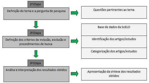 Almejando o rigor do andamento da pesquisa, inspirados em autores como Botelho, Cunha e Macedo (2011) e Carvalho (2020), a revisão integrativa foi dividida por meio de três etapas específicas, conforme apresentada na Figura 1. Após a definição do tema e a pergunta de pesquisa, para selecionar os estudos que foram analisados, houve a necessidade de estabelecer critérios de inclusão/exclusão e procedimentos de busca na base de dados da SciELO.