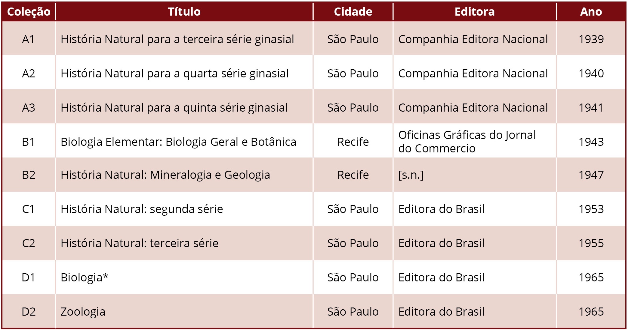 Foram analisados os traços morfológicos e estilísticos de nove livros didáticos de História Natural/Biologia de autoria de Valdemar de Oliveira, produzidos para o ensino secundário e publicados entre 1939 e 1965, conforme se observa no Quadro 1. Os livros foram identificados por um código alfanumérico, com a letra caracterizando cada uma das coleções (A, B, C e D).