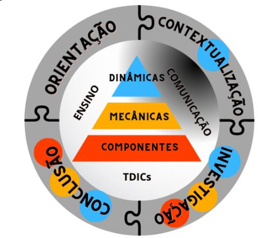 No modelo apresentado (Figura 1), os pilares da gamificação, demonstrados ao centro são indicados pelas cores azul, alaranjado e vermelho, estão imersos nos elementos do ensino por investigação, indicados no círculo cinza (peças de um quebra-cabeça). Ao centro, destacamos que todo o processo ocorre por meio de processos comunicativos e de interação entre os alunos, em meio ao ensino remoto e com uso de TDICs. Para unir as duas abordagens, sugere-se que os elementos de dinâmicas de jogos (marcada no esquema em azul) sejam utilizados nas fases de contextualização, investigação e conclusão. As mecânicas (marcadas em cor alaranjada) podem ser utilizadas nas fases de investigação e conclusão. Quanto aos componentes de jogos (marcados em cor vermelha), eles podem ser atribuídos nas fases de investigação e conclusão.