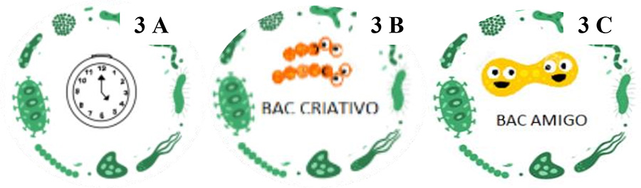 A realização das missões agregaria pontos às equipes, que para se adequar a linguagem utilizada nos jogos, foram chamados de XPs (Experience Points) e distintivos. Os distintivos foram nomeados de acordo com a temática central da SDGI e buscavam incentivar algumas ações nos estudantes. Para promover a cooperação entre os grupos adversários, criou-se Bac amigo (3A), Bac veloz para incentivar a realização das atividades de forma mais rápida (3B), e Bac criativo para motivar os estudantes a se dedicarem no desenvolvimento das atividades (3C) (Figura 3). Outro elemento confeccionado foi o placar, no qual conforme as missões iam sendo cumpridas, acrescentava-se os XPs e distintivos conquistados.