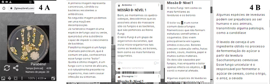Os alunos foram orientados para se organizarem em duplas e entregavam as atividades indicadas nos diferentes níveis da SDGI via postagem na plataforma Padlet no momento que foi solicitado pelo professor. Na Figura 4 podem-se observar algumas respostas dos alunos para as atividades propostas. Ao responderem à questão norteadora no Nível 1, os estudantes apontaram os microrganismos como sendo os alvos do massacre e, também, comentaram sobre o papel desses seres na decomposição e, também, sobre seus malefícios. Após montarem os quebra cabeças (Figura 4A), investigarem e produzirem suas bandeiras percebe-se que os estudantes afirmam que a maioria das imagens dos quebra cabeças fazia referências aos fungos, e não mencionaram as bactérias. Mesmo assim, começaram a se questionar se esses “seres” fariam falta em nosso meio caso extintos, percebendo que não são apenas causadores de doenças (Figura 4B).