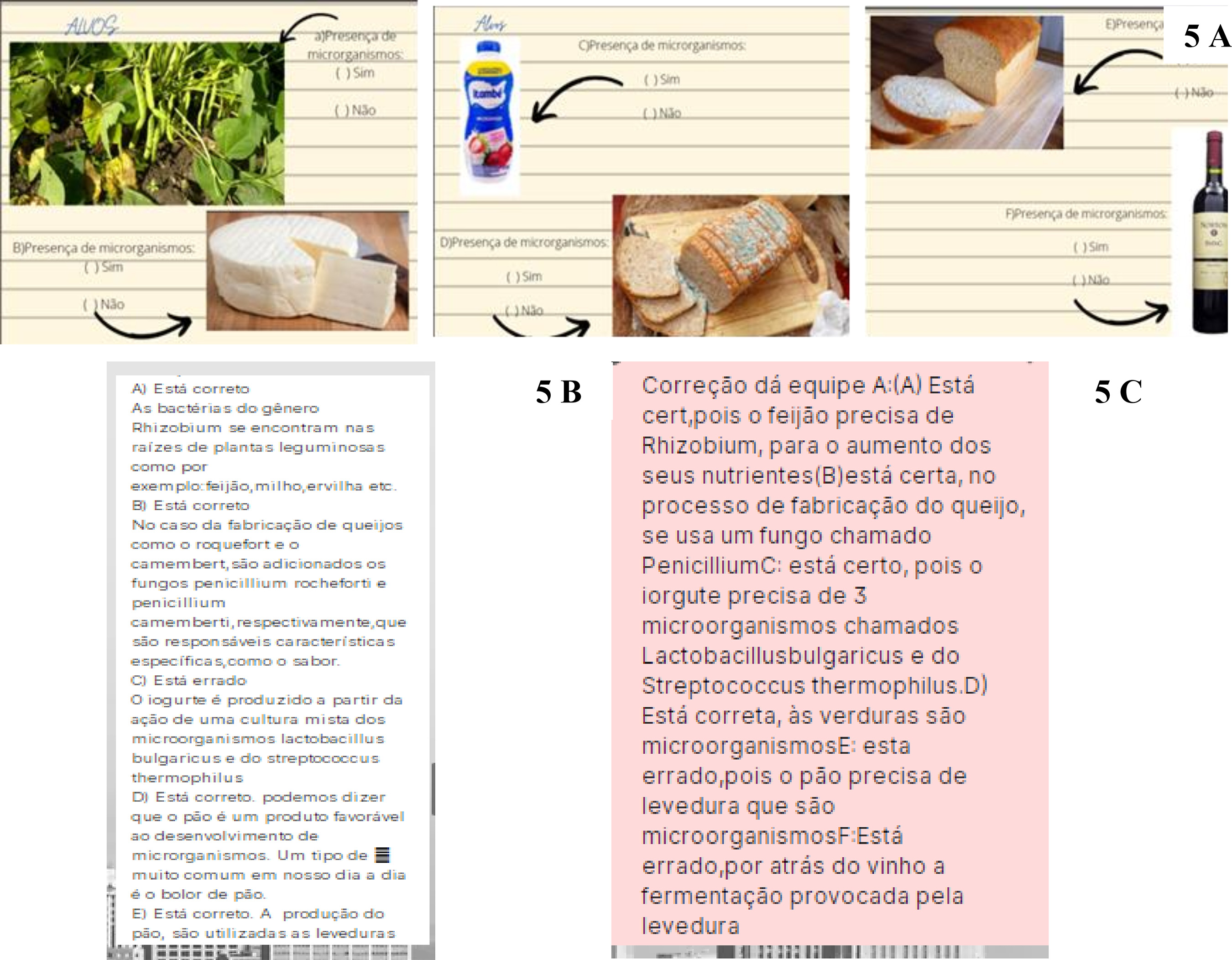 No Nível 2 da SDGI os alunos classificaram as imagens fornecidas (Figura 5 A) de acordo com seus conhecimentos quanto a presença de microrganismos. A partir das respostas dos alunos, observou-se que os alunos tinham conhecimentos prévios sobre o assunto, mas demonstraram dificuldade no entendimento do processo de fermentação por via anaeróbica, três das quatro duplas participantes classificaram a imagem que apresentava uma garrafa de vinho como um local com ausência de microrganismos. Esses conhecimentos prévios foram complementados na missão B de investigação onde as equipes foram organizadas para que pesquisassem e realizassem a correção das hipóteses de uma das equipes adversárias (Figura 5 B e 5 C) indicando onde estava errada, e complementando as respostas corretas.