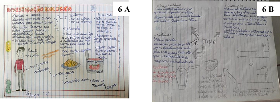 No nível 3, os estudantes conheceram o storytelling em que Bac acessa conversas de Geogênio e de seus familiares relatando alguns sintomas de saúde. Após passarem pelas etapas de contextualização e sondagem dos conhecimentos prévios durante a Missão A, na missão B as duplas investigaram e produziram mapas conceituais sobre os sintomas de um dos familiares. Na missão C apresentaram seus conhecimentos construídos nesses mapas (Figura 6 A e 6 B). Nessa parte de apresentação final ficou expressa a aquisição de conhecimentos sobre os microrganismos causadores de doenças, pois os estudantes passaram a serem capazes de diagnosticar quais os patógenos envolvidos em algumas doenças, os sintomas, tratamentos e até curiosidades sobre assuntos antes desconhecidos por eles.