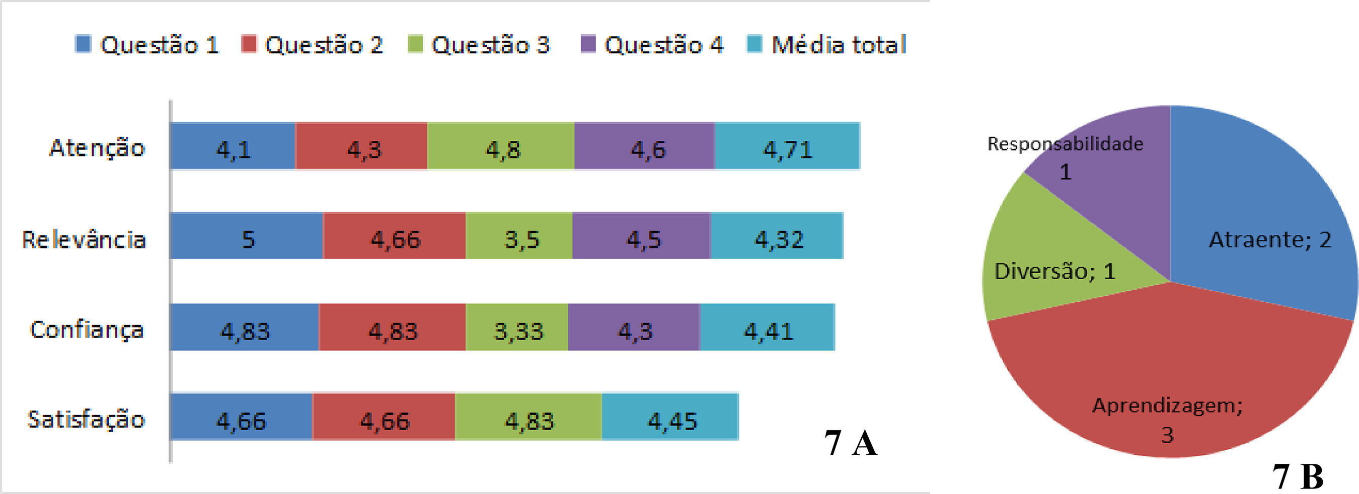 Os resultados obtidos mediante ao questionário ARCS mostram que os estudantes tiveram boa aceitação da proposta da SDGI, pois a classificação regular e insuficiente foi pouco assinaladas e todas as categorias de avaliação: “Atenção”, “Relevância”, “Confiança” e “Satisfação” alcançaram na escala de 1 a 5, médias totais entre 4,32 a 4,71 conforme podemos observar na Figura 7 A.