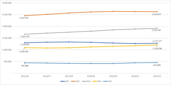 The typical pathway through compulsory education in England begins with primary school, specifically Key Stage (KS) 1 and KS2. KS1 (Years 1 to 2) covers children aged 5 to 7, and KS2 (Years 3 to 6) includes children aged 7 to 11. At this point in the pupil pathway, other state-funded schools exist, such as lower and middle schools, but these are rare, with only 23 schools in the UK in 2021/22 (DfE, 2023b). Considering only state-funded schools, KS1 enrolment has shown a gradual decline in recent years, from 1.29 million students in 2015 to 1.27 million in 2022. According to the 2021 Census by the Office for National Statistics (ONS, 2021), the population between 5 and 15 years old increased between 2011 and 2021. Nonetheless, the population between 0 and 4 years old decreased significantly in the last decade, which may explain why the drop in KS1 only started to have effects from the 2017 school year onwards.