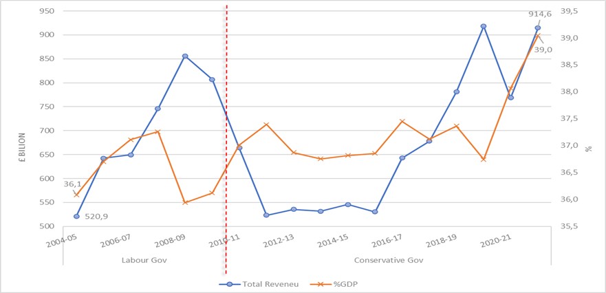 To begin the analysis, it is relevant to examine the rise of the share of public spending relative to government revenues over time. Figure 2 shows the total government revenue as a percentage of the Gross Domestic Product (GDP). Overall, following a period of decline and stagnation in tax revenue from 2009 to 2017, which started with the economic crisis in 2008, the government has gradually increased its revenue, as is evident from the total spending and its share of the GDP. Currently, as shown in the graph, the budget allocation within the government has reached its highest levels in terms of revenue and its share of the GDP. Considering inflation, the financial year of 2004 started with approximately £520 billion and reached £914 billion in 2022. In terms of the GDP, it increased from 36% to 39% in almost two decades.