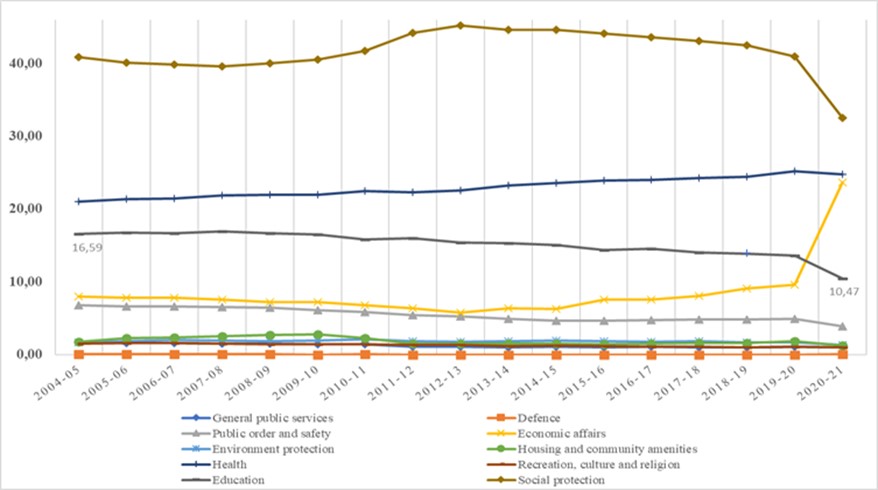 To analyse the public expenditure in more detail, Figure 3 shows data from the HMT, dividing public expenditure by areas and presenting it as percentages from 2004 to 2021. Five areas stand out in Figure 3, providing a ranking of investment. The largest investment is in social protection, which includes sub-functions such as pensions, unemployment social services, and social housing. However, investment in this area has been falling since 2012 and more dramatically in the last two years. Health ranks second, which has been steadily growing over time, reaching 25% of the total public budget in 2021. Historically, education has been the third largest area of public investment. However, unlike health, the education sector has been receiving less funding each year, decreasing from about 16% of the total public budget to only 10% in 2021. Economic affairs have also received considerable attention from governments, especially after 2012. During the COVID-19 pandemic, the government chose to allocate additional funds to this area, making it the third largest area of expenditure instead of education. The increased spending on economic affairs was mainly directed towards the Job Retention and Self-Employment Income Support Schemes and supporting businesses across the country (BRIEN, 2022). Lastly, the fifth area that stands out is public order and security, which covers police services, law courts, prisons, and other aspects. Although it carries significant costs, investment in this area has also declined over time.
