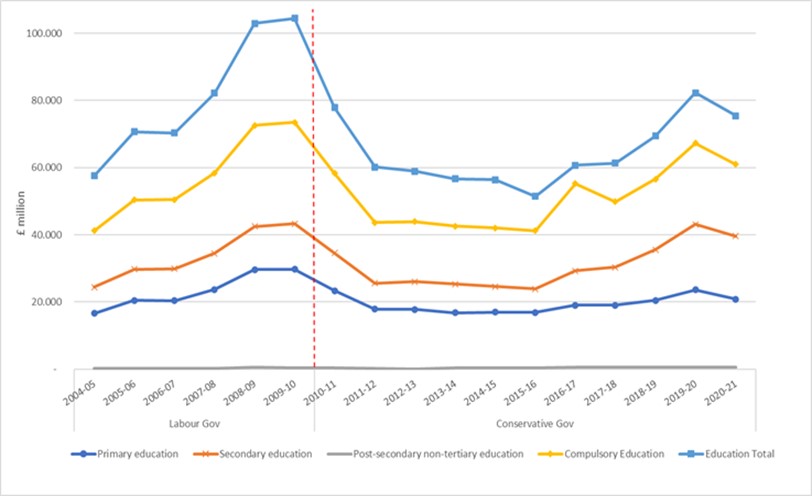 Financing education appropriately is one of the most important items on the public agenda, but how much to spend and how to manage the budget are highly contentious topics. Accordingly, education expenditure in England has been a matter of great political debate. The line of reasoning in these discussions is marked by two related facts: the first issue is the decline in education spending since 2010, when public cuts started to affect the sector after nearly a decade of budget increases. Secondly, education spending as a share of the total public budget has declined over time, reaching the same low point seen in the 1980s (BOLTON, 2021; DRAYTON et al., 2022).