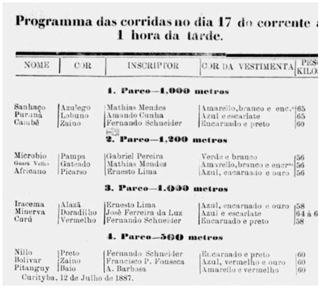 Os corredores da 1º. 3º e 4º turmas deverão ter 60kilos de peso e os da 2º turma 52kilos. Até 8 dias antes das corridas serão aceitas inscripções (Dezenove de Dezembro, 1882, p. 4).