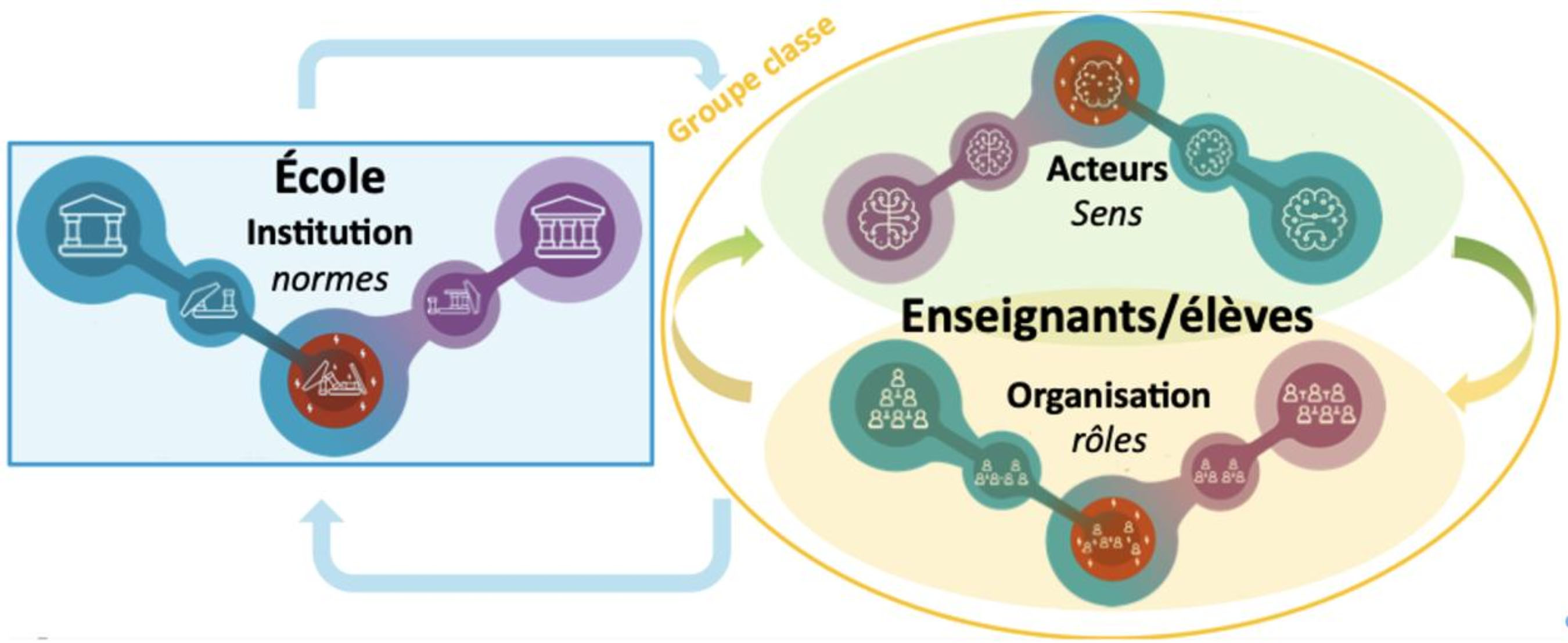 Avec cette grille de lecture, nous considérons que la directive de 2008 implémente un système intégratif dans le canton de Berne, cela relevant d’un changement légal, normatif, qui concerne la dimension institutionnelle. Or, celle-ci redéfinit les conditions-cadre de la classe en tant qu’organisation, touchant directement le système de rôle, puisque les frontières sont questionnées et qu’un nouveau type de public l'investit.