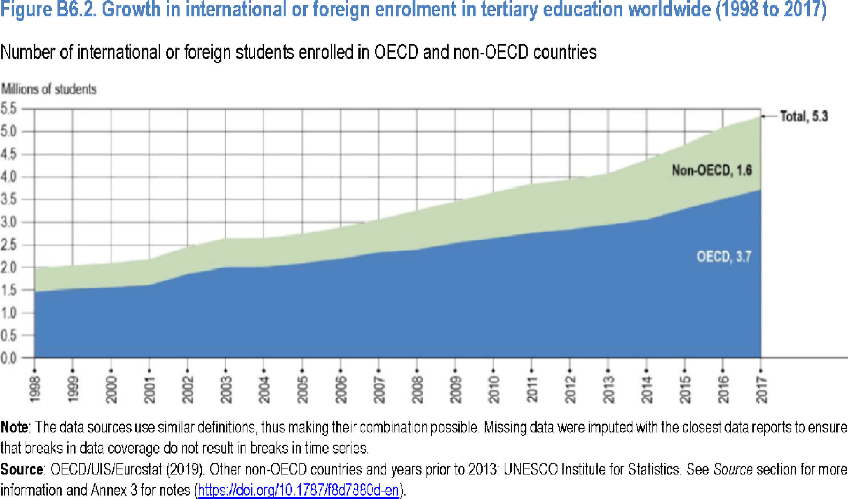 É possível evidenciar um grande crescimento no período de 1998 a 2017 (OCDE, 2019). No ano de 1998, existia cerca de 2 milhões de estudantes em mobilidade, considerando os países da OCDE e aqueles que não pertencem à OCDE, com a primazia para a primeira. Esse número cresce ano a ano, chegando, em 2017, a um total de 5,3 milhões de estudantes em mobilidade estudantil, sendo que 3,7 milhões estão nos países da OCDE e 1,6% nos demais países.