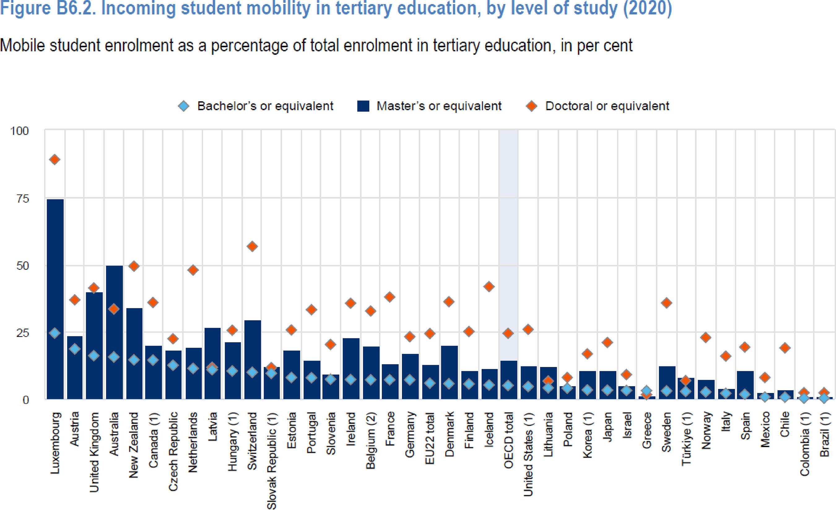 Nas análises apresentadas, fica evidente que, em quase todos os países da OCDE (2022), a parcela dos estudantes internacionais matriculados sem programas terciários aumenta com o nível de Ensino superior. Nos países da OCDE, os estudantes internacionais representam 7% do total de matrículas em programas terciários. Os alunos de bacharelado representam apenas 5% (em quase 40% dos países nos quais os dados estavam disponíveis) dos alunos em mobilidade, 14% dos alunos são de mestrado e 24% de doutorado. A proporção da mobilidade estudantil é maior nos níveis de doutorado, seguido do nível de mestrado e depois pelo bacharelado.