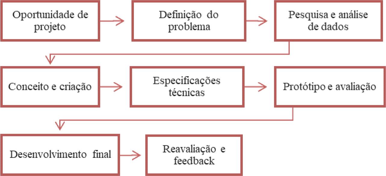 Foram selecionadas para estudo 5 modelos metodológicos, sendo 3 modelos clássicos e com grande aplicação em áreas de Design (Bonsiepe, Munari e Löbach) e 2 modelos mais atuais com aplicação na área de saúde, Merino (2014) e Casagranda (2016). Com base na análise dos modelos foi definido um modelo metodológico consensual para o estudo representado na figura 3.