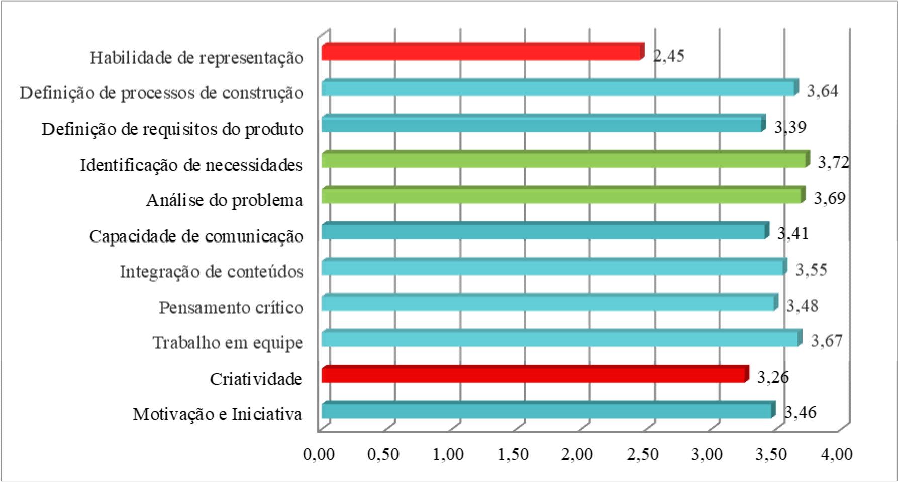 Os resultados de 0 a 4 dos itens agrupados em competências são mostrados na figura 4, onde se observam melhores médias de avaliação para a Análise do problema (3,69) e a Identificação das necessidades do usuário (3,72). Por outro lado, as competências com menor média de autoavaliação foram a Criatividade (3,26) e a Habilidade de representação (2,45).