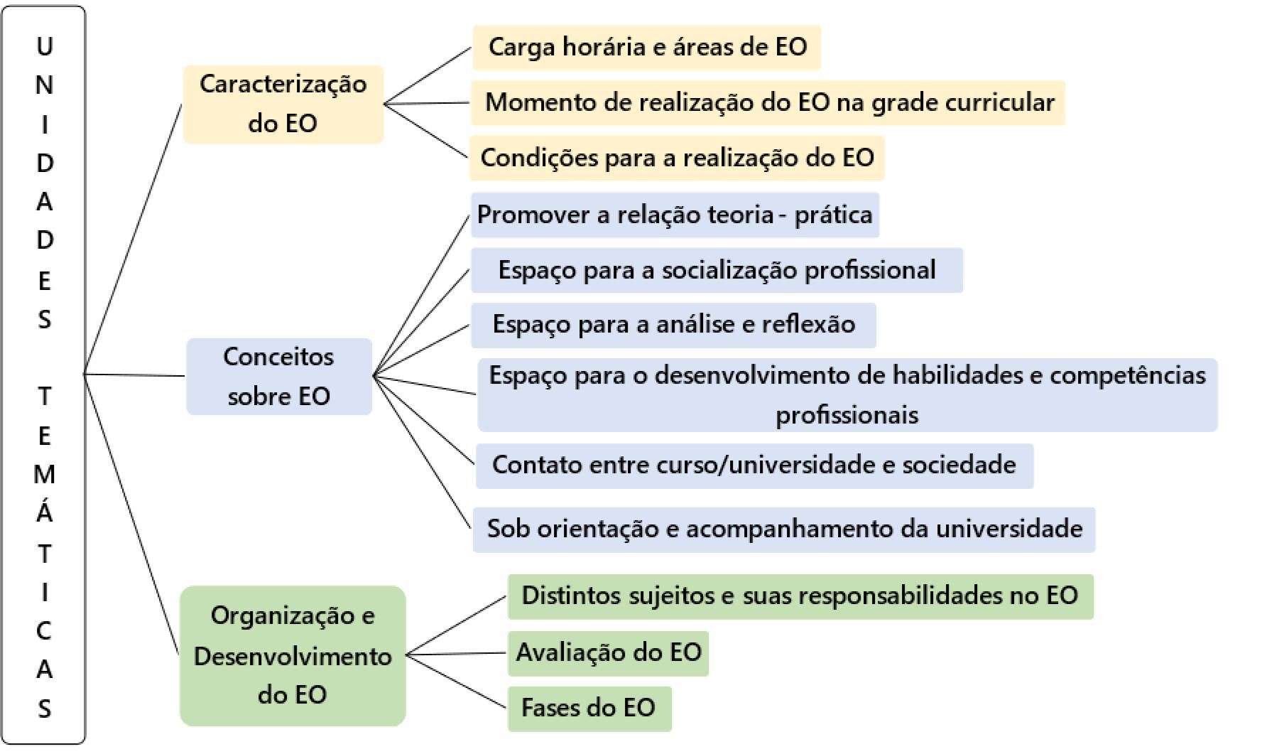A unidade temática ‘Organização e desenvolvimento do EO’ envolve a análise dos distintos atores e suas responsabilidades no EO, as características das instituições conveniadas para EO, a avaliação do EO e as fases do EO (Figura 3).