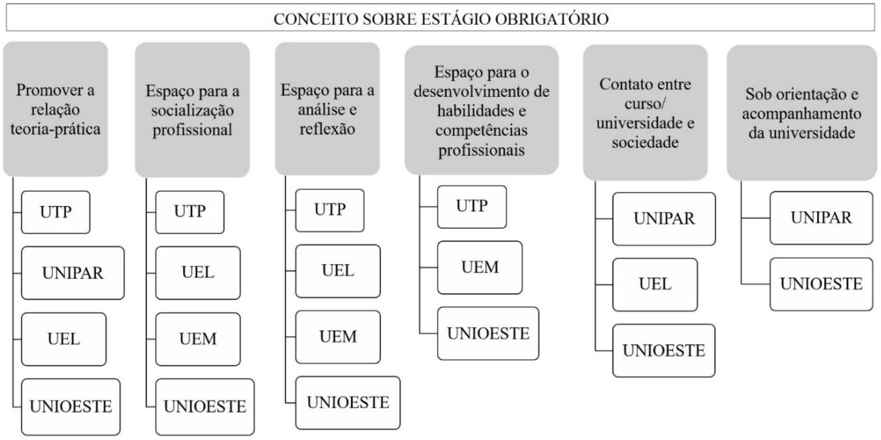 Outro conceito verificado com a mesma frequência do anterior entre as universidades foi a ideia de que o EO é um espaço para a socialização profissional, já que promove o contato prolongado em ambientes de trabalho para oportunizar a inserção profunda na prática profissional (UNIOESTE, 2014). Além disso, são ressaltadas as ideias de que o EO permite o intercâmbio de experiências para o exercício profissional (UEM, 2015b; UNIOESTE, 2017), uma transição profissional (UNIOESTE, 2014), o contato com tendências do mercado de trabalho em relação à profissão (UEL, 2014), promove a aprendizagem profissional (UTP, [s.d.]; UEL, 2014; UNIOESTE, 2017) e o contato com o mercado de trabalho visando a futura inserção dos graduandos e graduandas nesses locais (UTP, 2017).