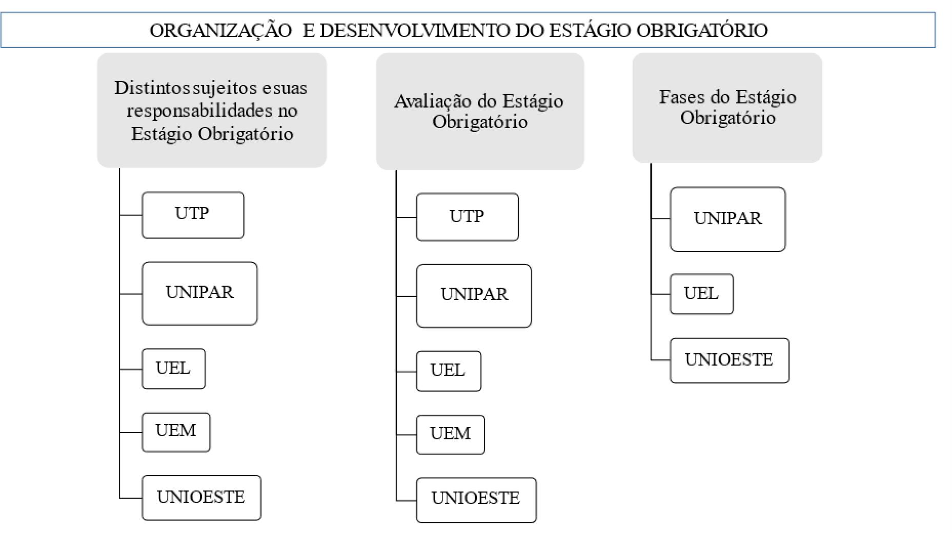 Na UEL como o regulamento não está atualizado com o PP do curso, o detalhamento de fases não corresponde com os EO presentes no PP. E na UNIPAR dividem-se as disciplinas de EO em fases, sendo que o Estágio II corresponde à intervenção propriamente dita e o Estágio I envolve a observação e coparticipação (UNIPAR, 2008). Nesse caso, não está claro como é o processo de inserção desse/a estudante no Estágio II após finalizar no ano anterior o processo de observar e coparticipar nos locais de estágio.