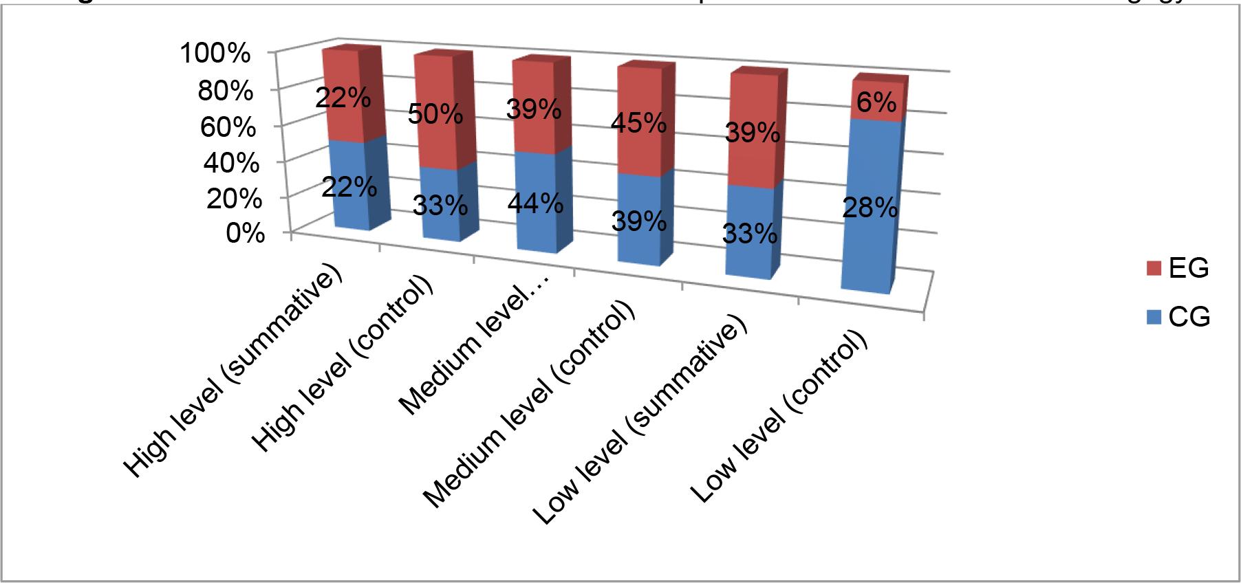 The results of the study show that high indicators prevail among the EG and CG students, however, EG students have 11.1% more high indicators, and there are no low indicators. Analytical materials of practice reports generally reflected the level of proficiency of interns in such skills as constructive, organizational, and communicative. A high level of proficiency in pedagogical skills and abilities was revealed during the control stage in 50% of EG students and 30% of CG students (Figure 3).