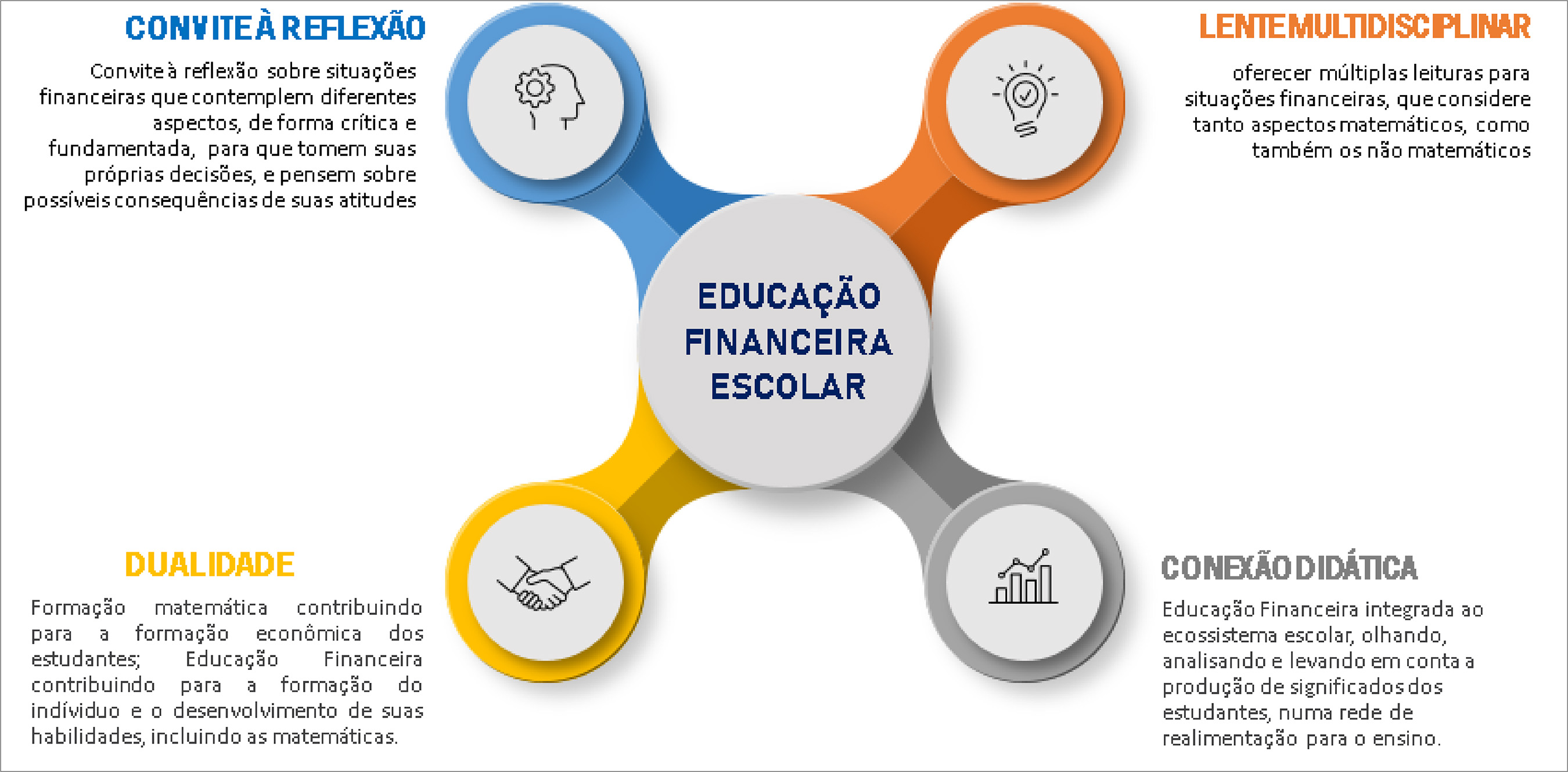 A dualidade marca uma posição: a EFE pode e deve ser uma via de mão dupla, e, portanto, dual, de modo que tanto os conhecimentos matemáticos dos estudantes os auxiliem na compreensão, análise e tomada de decisão em situações econômicas e financeiras (SEF), como a abordagem da Educação Financeira contribua para o desenvolvimento das habilidades matemáticas dos estudantes, ou seja, de forma que o ensino da Matemática e a Educação Financeira sejam dois lados de uma mesma moeda.