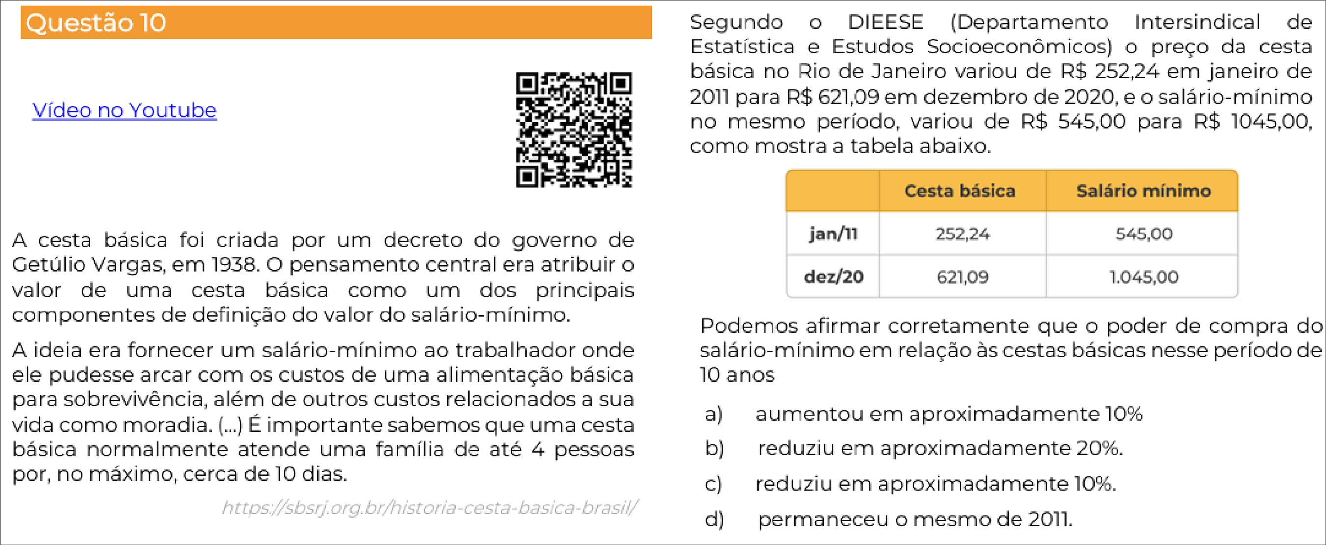 Além disso, a questão abre uma possibilidade de discussão sobre o impacto social da inflação na capacidade de consumo das famílias em relação à cesta básica. Portanto, a abordagem desta questão proporciona ao estudante uma visão que envolve as dimensões social, política e econômica sobre as situações atuais de consumo, trabalho e dinheiro, tal como preconiza a BNCC.