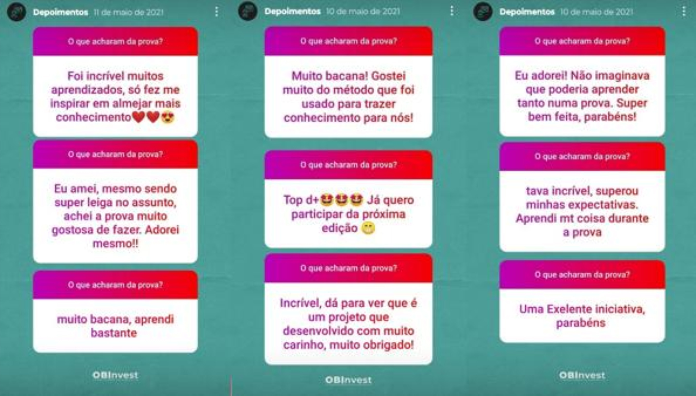Figura 9 Alguns comentários de participantes da 1ª Edição da OBInvest (Dados coletados na plataforma)
