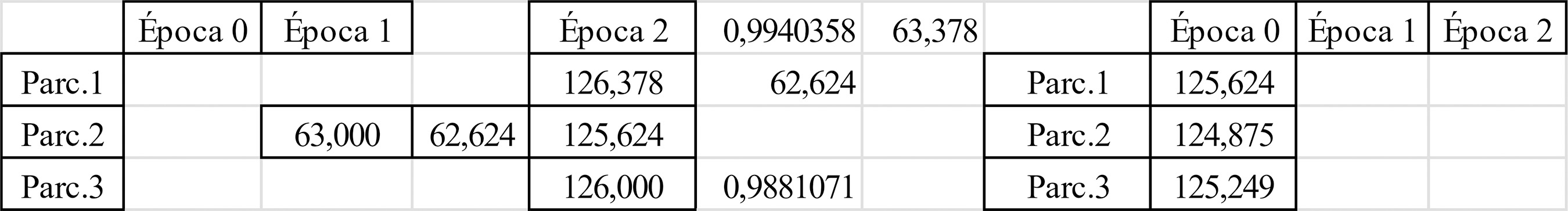 Na época 0, a quantia V apresenta o menor valor no parcelamento 2 e o maior valor no parcelamento 1. Como esperado, as conclusões obtidas na época 2 serão sempre as mesmas em qualquer época escolhida para a análise. A Figura 1 mostra os valores de V, com o auxílio de uma planilha.