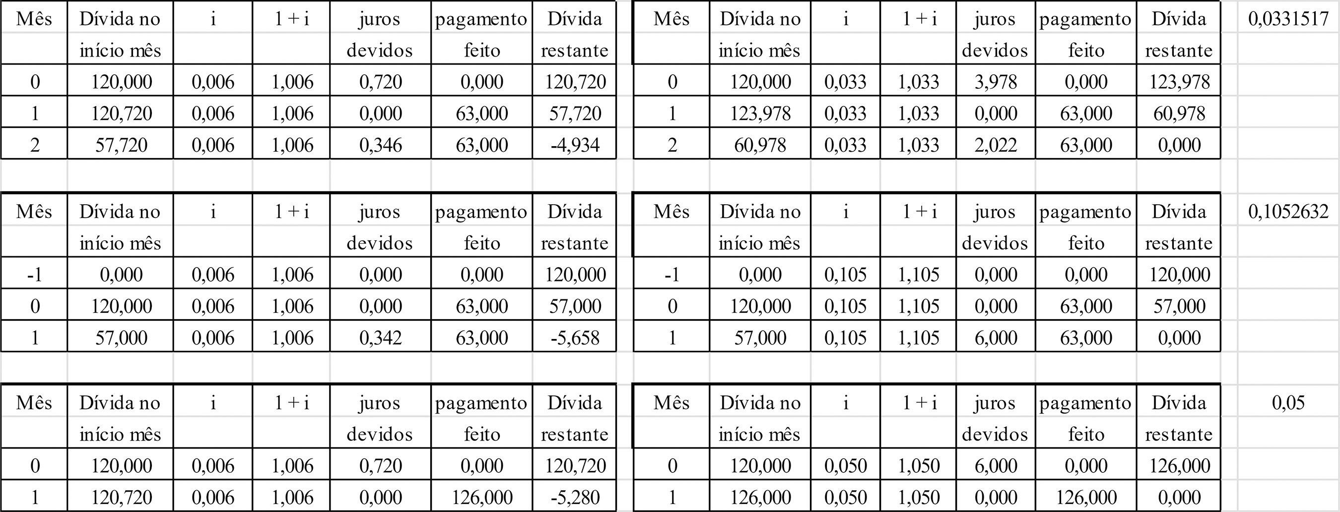 Esses são os valores dos juros cobrados pelo lojista para cada parcelamento (tabelas à direita). Também a Figura 2, tabelas à esquerda, ilustra o panorama da dívida para cada parcelamento segundo a possibilidade de André fazer render o seu dinheiro a uma taxa mensal de juros de 0,6% e ter de saldar a dívida contando com os rendimentos que pode receber se aplicar o valor restante.