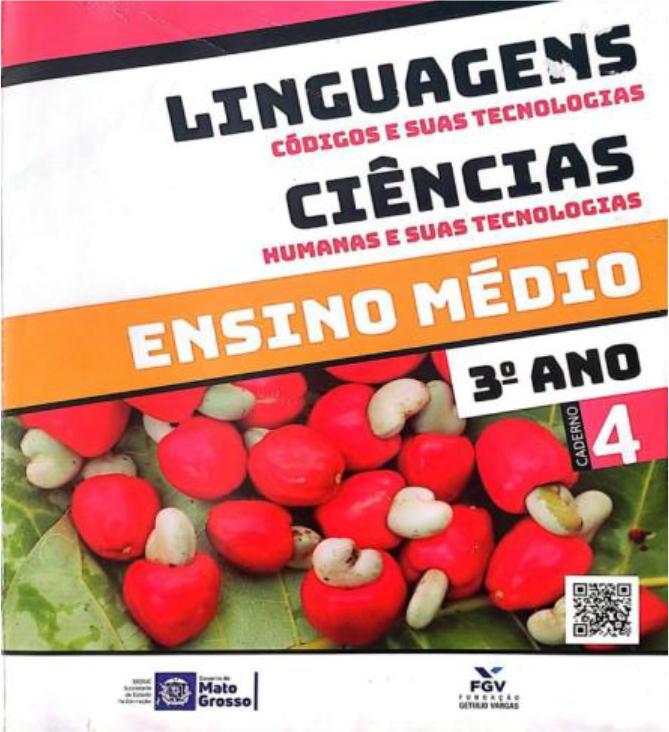 Na capa, como mostra a Figura 2, estão postos dados das duas áreas de estudo que o Caderno abrange: Linguagens e Códigos e suas Tecnologias e Ciências Humanas e suas Tecnologias e o ano do Ensino Médio, ao qual se direciona, 3°. A capa traz também a logomarca da FGV e da Secretaria de Educação do Estado de Mato Grosso (Seduc-MT), além do QR Code, que dá acesso ao ambiente virtual de aprendizagem Plurall, em que se solicita o login e a senha. Como indicado, as apostilas estão ligadas à “cesta” e não a um único “produto”, nos termos de Adrião et al. (2009), que inclui “soluções pedagógicas” (SeducMT, 2021).