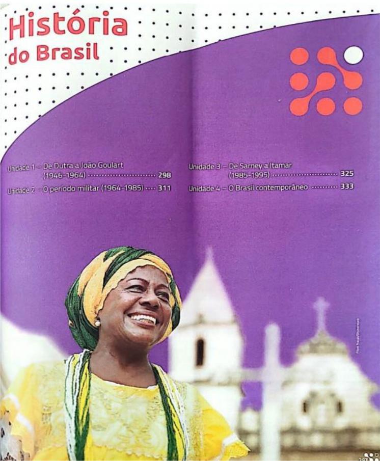 A História do Brasil, tema deste estudo, está dividida em 4 unidades e limita a história ao estudo dos governos, abordando de “Dutra a João Goulart” (1946-1960) na Unidade 1; “O período militar” (1964-1985) - quando o comum é referir-se a ele como o período da ditadura militar - na Unidade 2 (vale ressaltar que Dutra era um general de patente e esteve no governo inclusive no período anterior); “De Sarney a Itamar” (19851995), na Unidade 3. A obra encerra com a Unidade 4, que apresenta “O Brasil contemporâneo” como título e subtítulo “A democracia de volta”, com ênfase na Constituição de 1988.