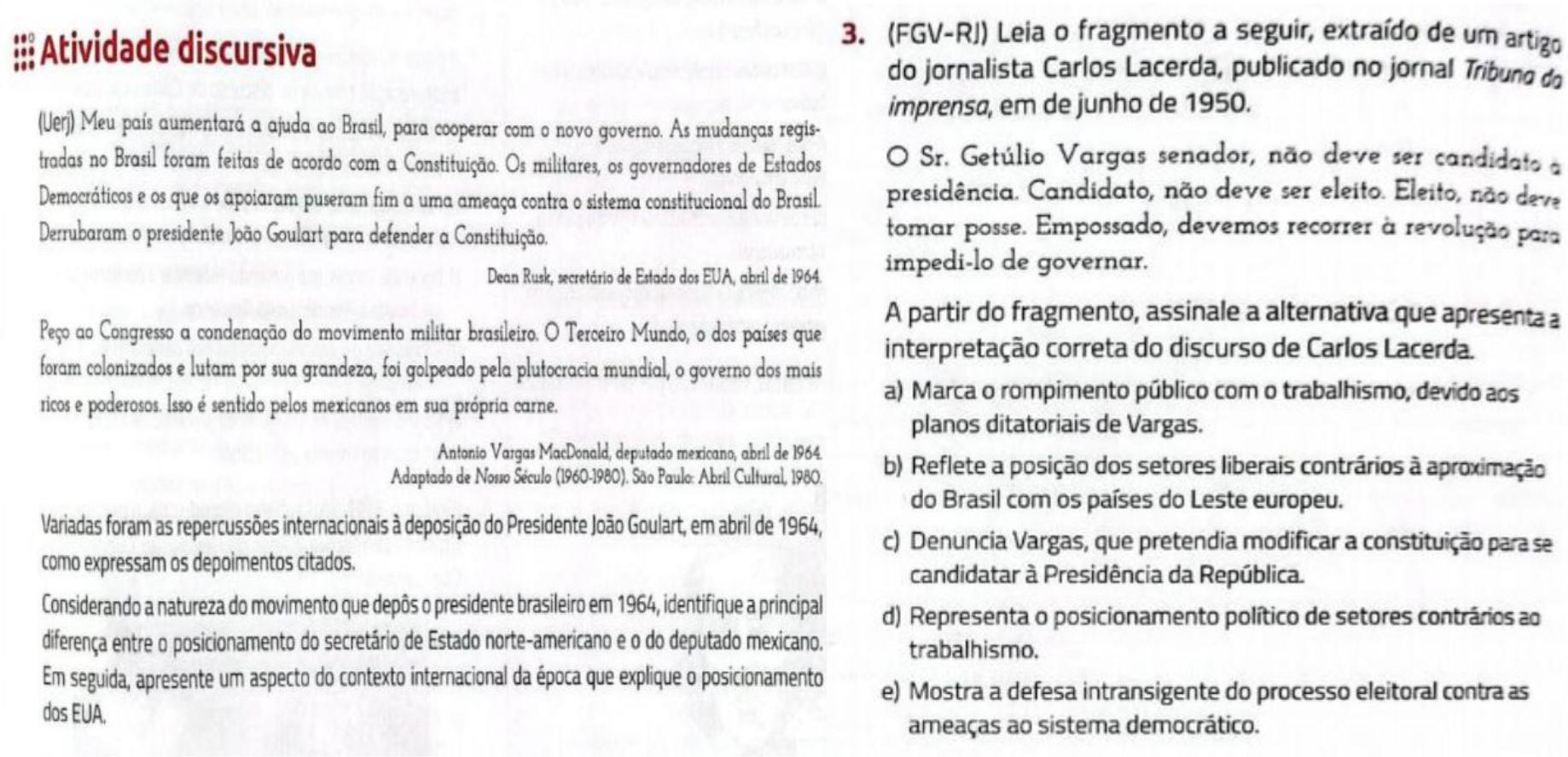 O material segue com diversas seções, como “atividades discursivas”, “atividades em sala”, “atividades para casa”, “mais Enem” e a proposta de uma síntese de unidades sob a estética de um mapa conceitual. Verifica-se um caráter diretivo para docentes, enfatizando que as atividades são todas retiradas de vestibulares, incluindo provas da Universidade Estadual da Paraíba (UEPB), da Universidade do Estado de Santa Catarina (UDESC), da Universidade Estadual de Maringá (UEM) e do próprio ENEM. Exemplos são apresentados na Figura 4, um da Universidade do Estado do Rio de Janeiro (UERJ), de uma atividade discursiva; e o outro da própria Fundação Getúlio Vargas-Rio de Janeiro (FGV-RJ), de uma atividade de múltipla escolha.
