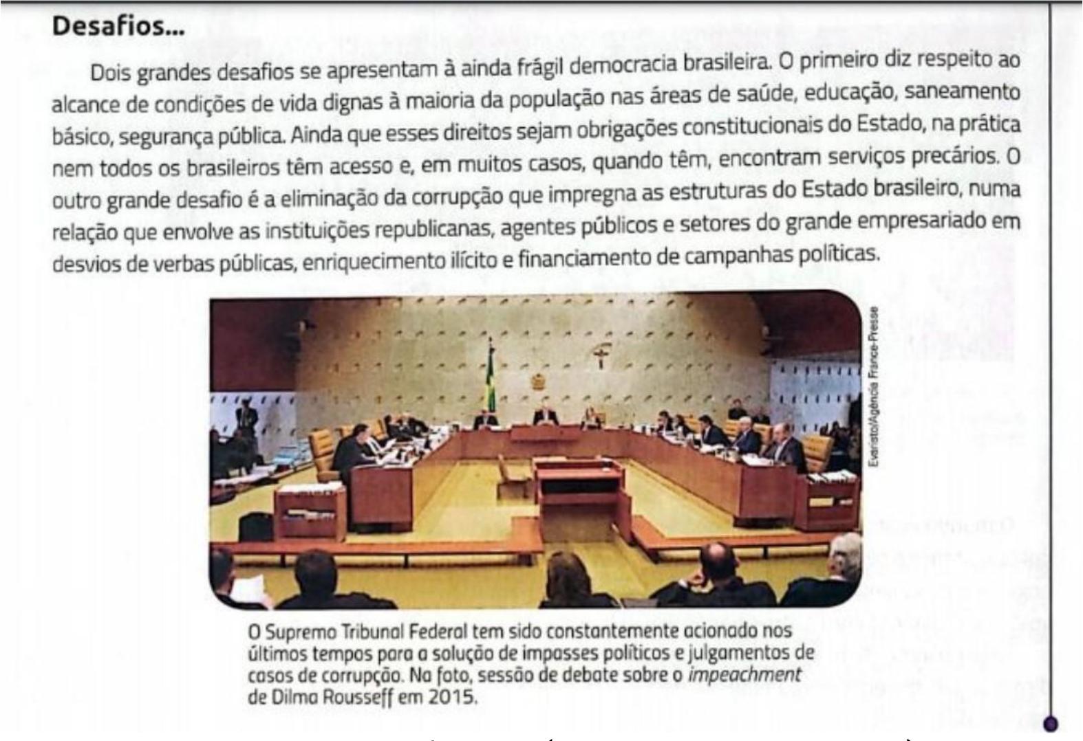O caderno 4 apresenta uma abordagem relevante do conteúdo, buscando tratar dos fatos históricos do Brasil em conformidade com a visão do autor. Todavia, em determinados momentos não se justificam as posições adotadas, como no caso em que se fala em fragilidade da democracia brasileira, sem informar a razão para essa qualificação na apostila (Figura 6).