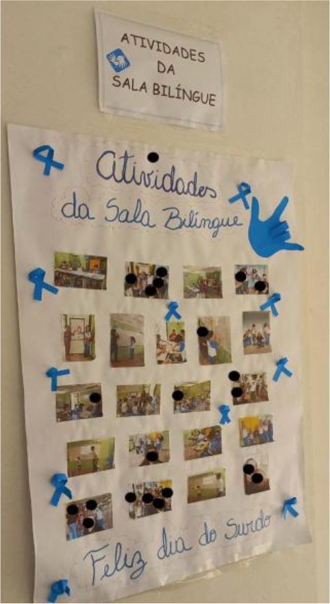 No que se refere ao ambiente escolar, pôde-se perceber a presença de cartazes com fotos das atividades e projetos realizados pelo profissional do AEE Bilíngue juntamente com os intérpretes e instrutora de Libras em comemoração ao Dia do Surdo, celebrado em 26 de setembro, como mostra a figura abaixo: