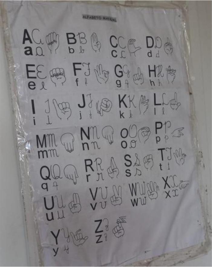 A única referência ao uso da Libras encontrado de forma visual na sala de aula foi um cartaz com as letras e seus sinais correspondem em alfabeto manual: